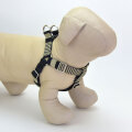 シンプルでベーシックなブラックが基調のボーダー柄のハーネスです。前足を入れるタイプのハーネスです。