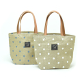 麻素材にドット柄のプリントを施した涼しげなお散歩バッグです。色はアイボリーとブルーの2種類です。取手は皮革を使用しています。